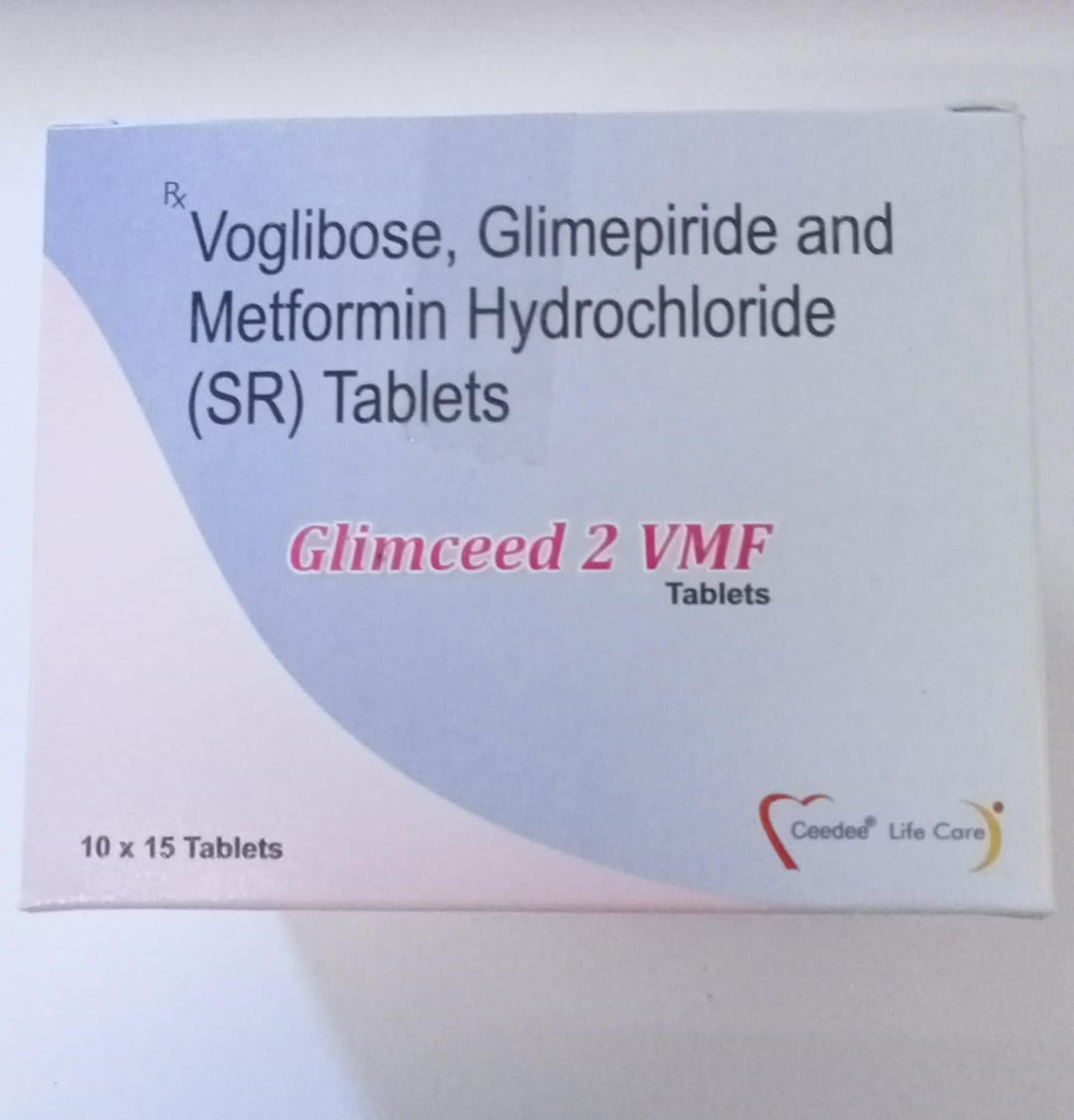 Glimceed 2 VMF Tablet is a combination of Glimepiride (2 mg), Voglibose (0.2 mg), and Metformin Hydrochloride SR (500 mg), designed to provide effective control over blood sugar levels in Type 2 Diabetes Mellitus. This unique blend works by: