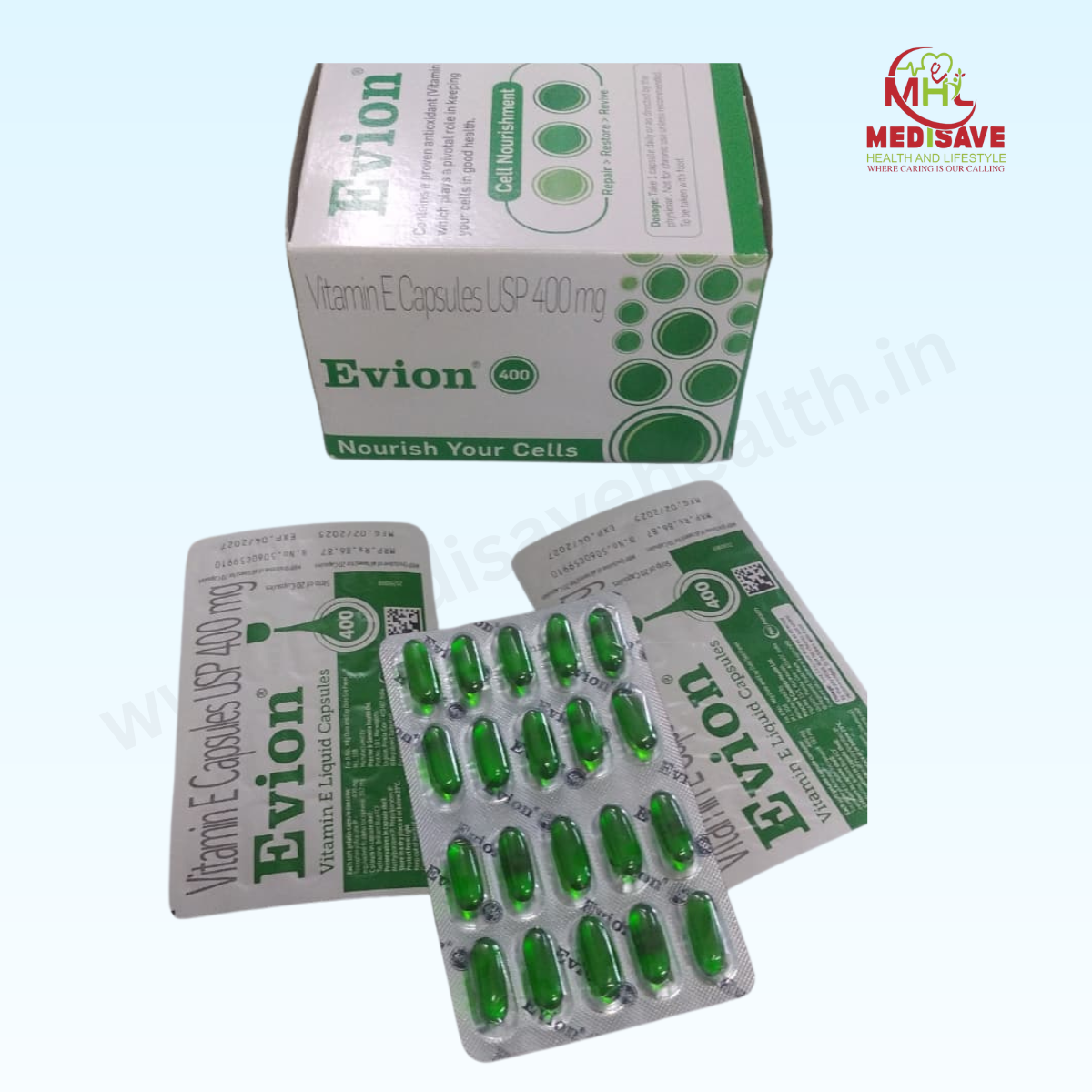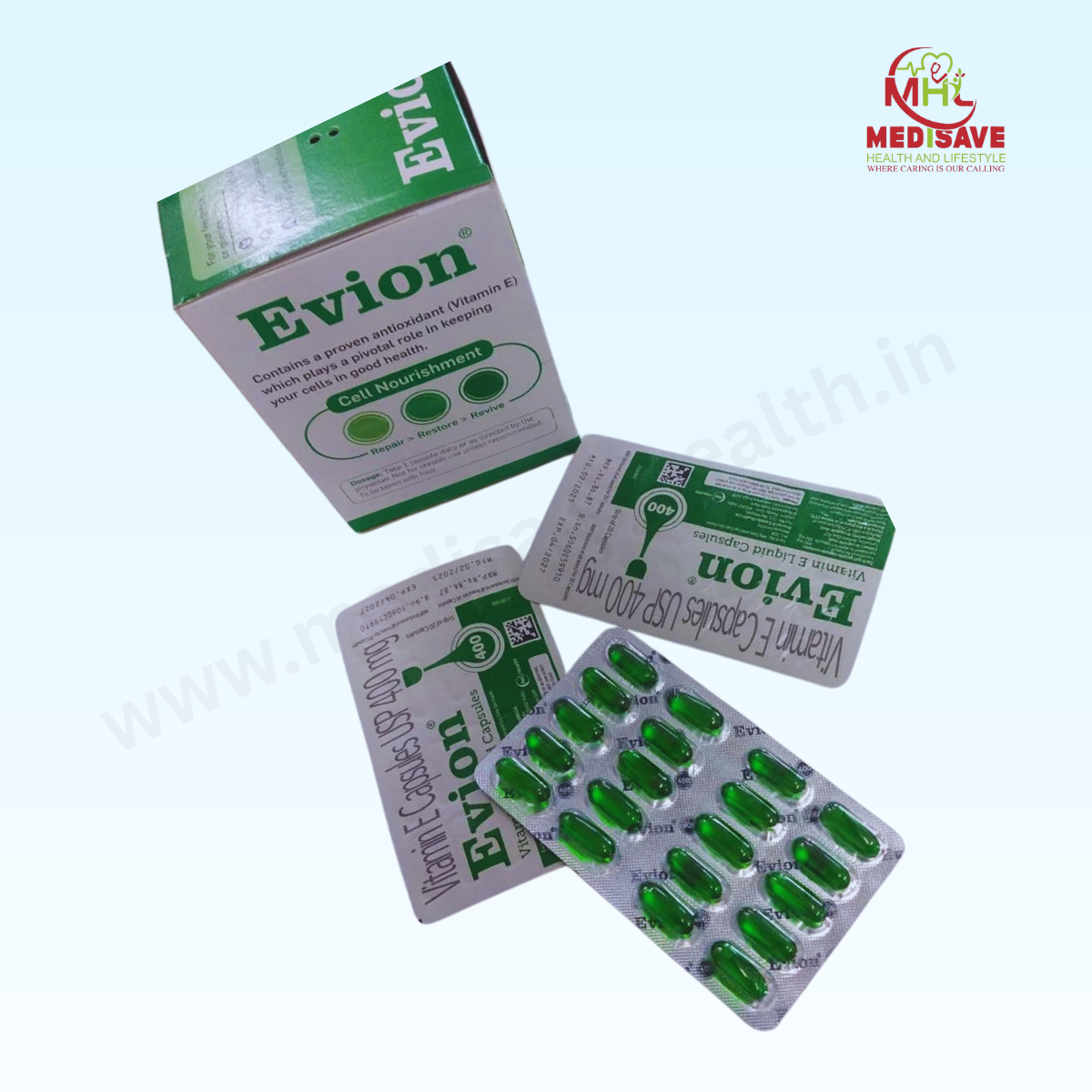 Evion 400 Capsule contains Vitamin E (400 mg), a fat-soluble antioxidant that protects body cells from oxidative stress. It promotes healthy skin, hair growth, and immune function, while improving blood circulation and protecting against cell damage. Evion 400 is also used in cases of Vitamin E deficiency and as an adjunct in certain skin disorders, muscle cramps, and cardiovascular health.