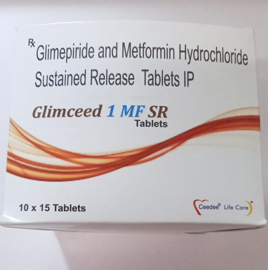 Glimceed 1 MF SR Tablet combines Glimepiride (1 mg) and Metformin Hydrochloride SR (500mg) for dual-action blood sugar control in patients with Type 2 Diabetes Mellitus. Glimepiride stimulates insulin secretion from the pancreas, while Metformin SR reduces hepatic glucose production and improves insulin sensitivity. Its sustained-release formulation ensures better glycemic control throughout the day with fewer doses.